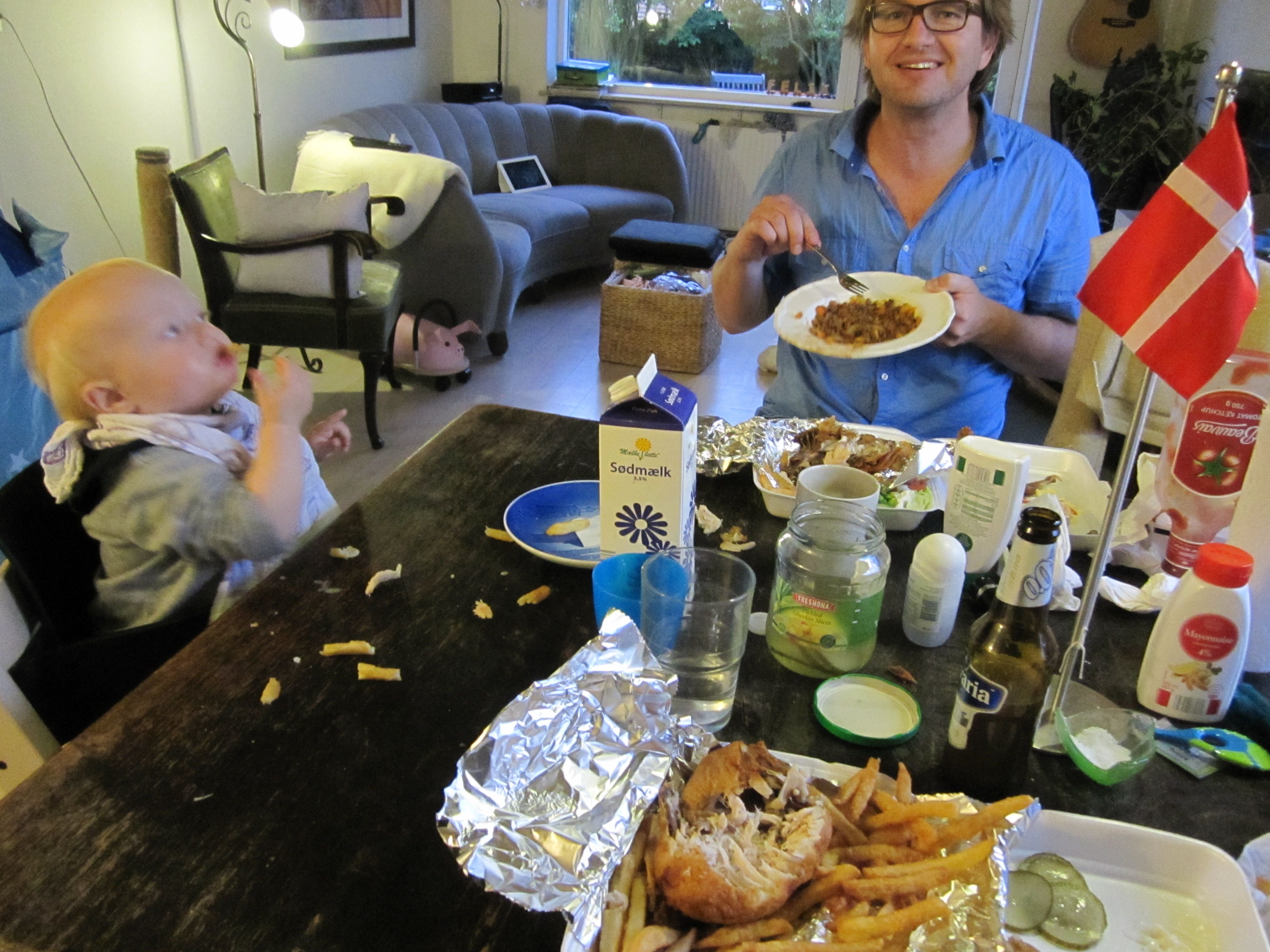 When the money arrived, Mads fell apart in tears and vomit, but we still found the strength to decorate our table with Danish flags. Rikke cracked open an alcohol-free beer like it was champagne, and then... we did the unthinkable… we ordered TAKE-OUT!