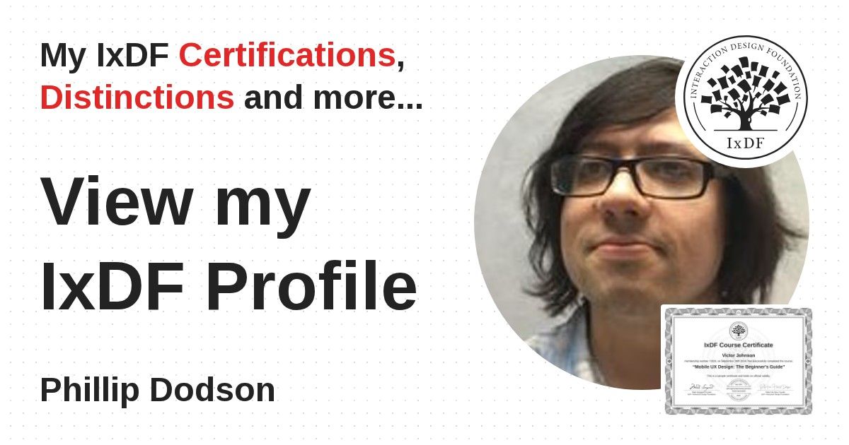 IxDF Course Certificates are awarded to Phillip Dodson in formal recognition of their coursework surpassing the rigorous benchmarks of exceptional performance established by the IxDF Educational Codex.