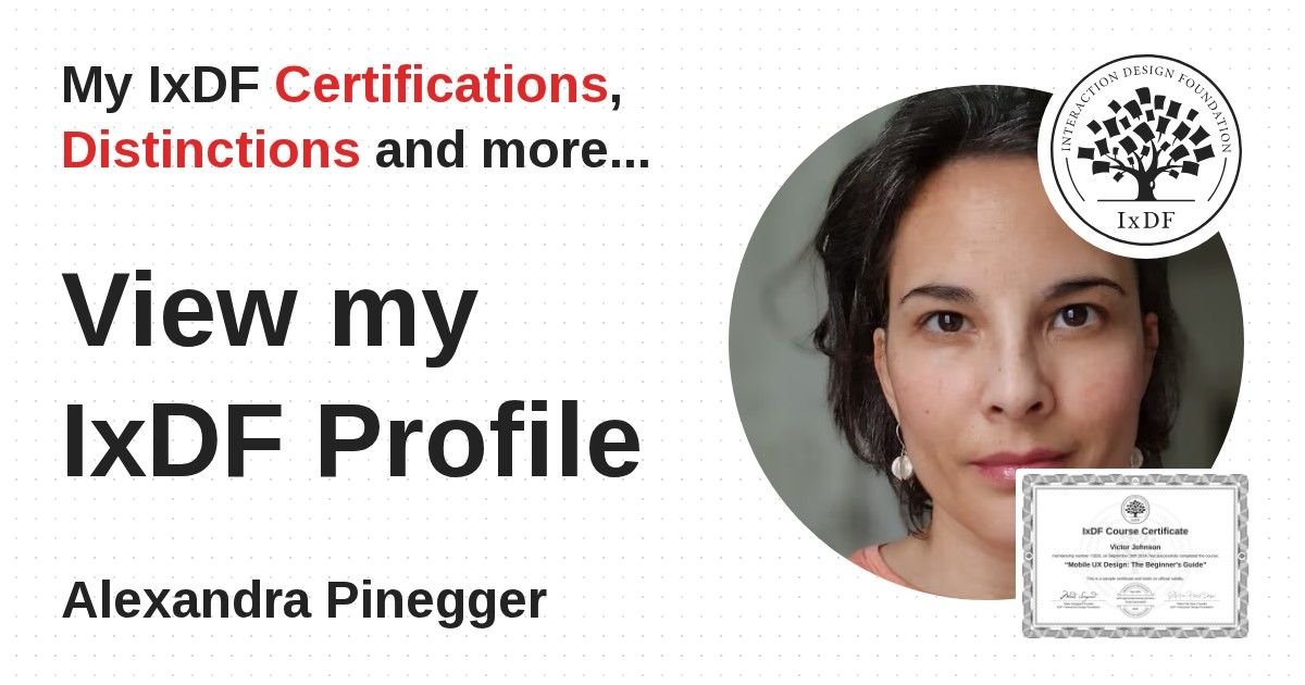 IxDF Course Certificates are awarded to Alexandra Pinegger in formal recognition of their coursework surpassing the rigorous benchmarks of exceptional performance established by the IxDF Educational Codex.