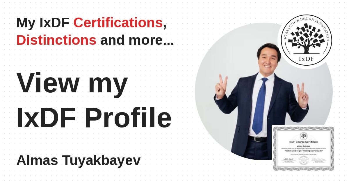 IxDF Course Certificates are awarded to Almas Tuyakbayev in formal recognition of their coursework surpassing the rigorous benchmarks of exceptional performance established by the IxDF Educational Codex.