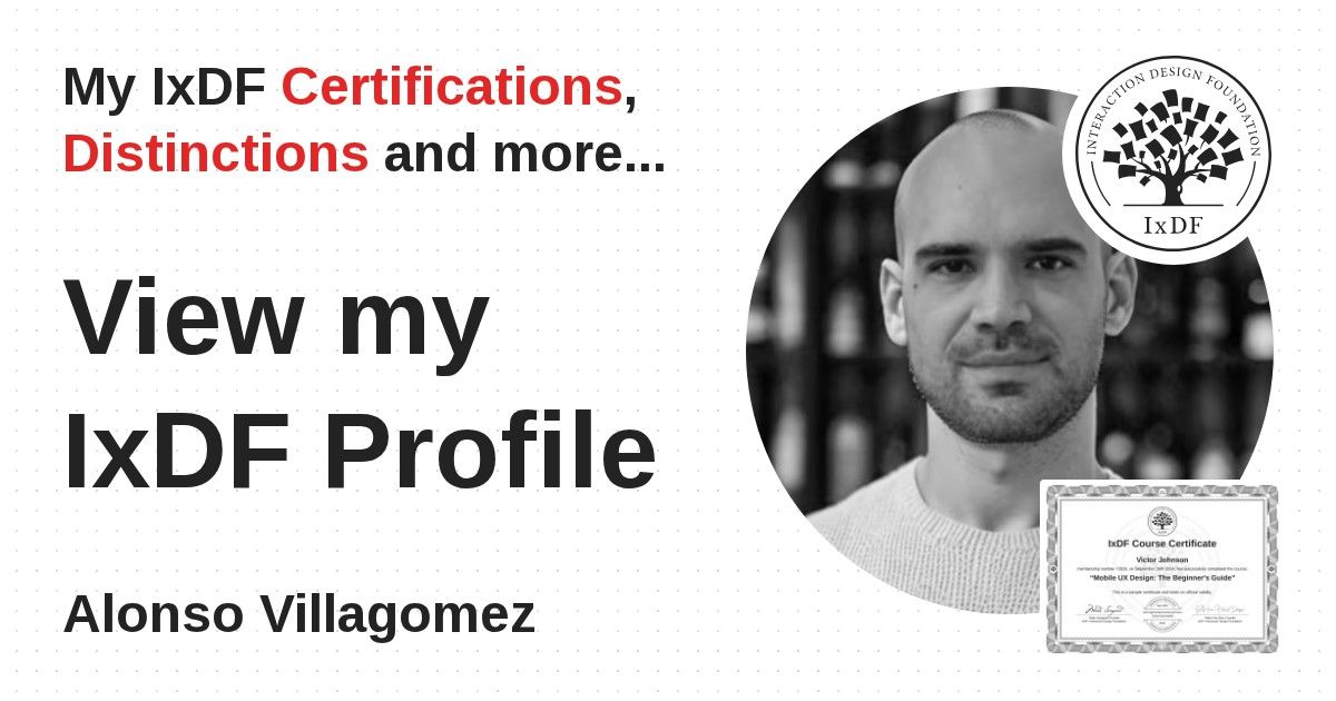 IxDF Course Certificates are awarded to Alonso Villagomez in formal recognition of their coursework surpassing the rigorous benchmarks of exceptional performance established by the IxDF Educational Codex.