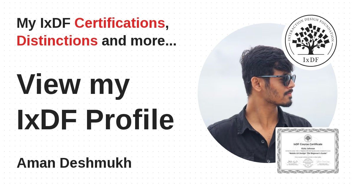 IxDF Course Certificates are awarded to Aman Deshmukh in formal recognition of their coursework surpassing the rigorous benchmarks of exceptional performance established by the IxDF Educational Codex.