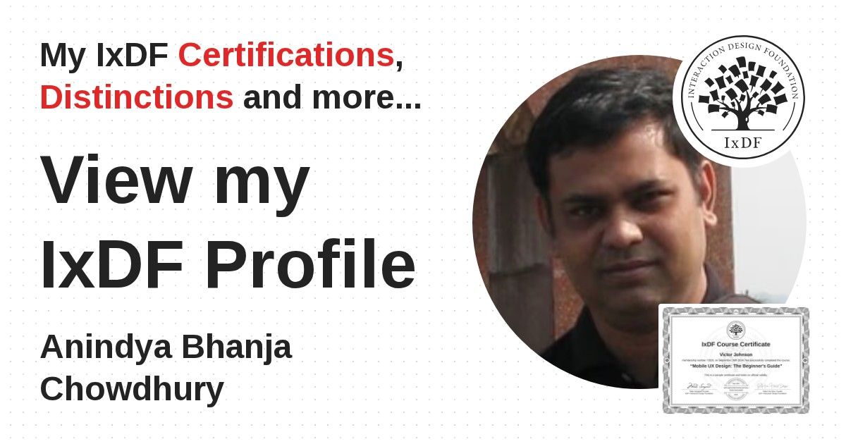 IxDF Course Certificates are awarded to Anindya Bhanja Chowdhury in formal recognition of their coursework surpassing the rigorous benchmarks of exceptional performance established by the IxDF Educational Codex.