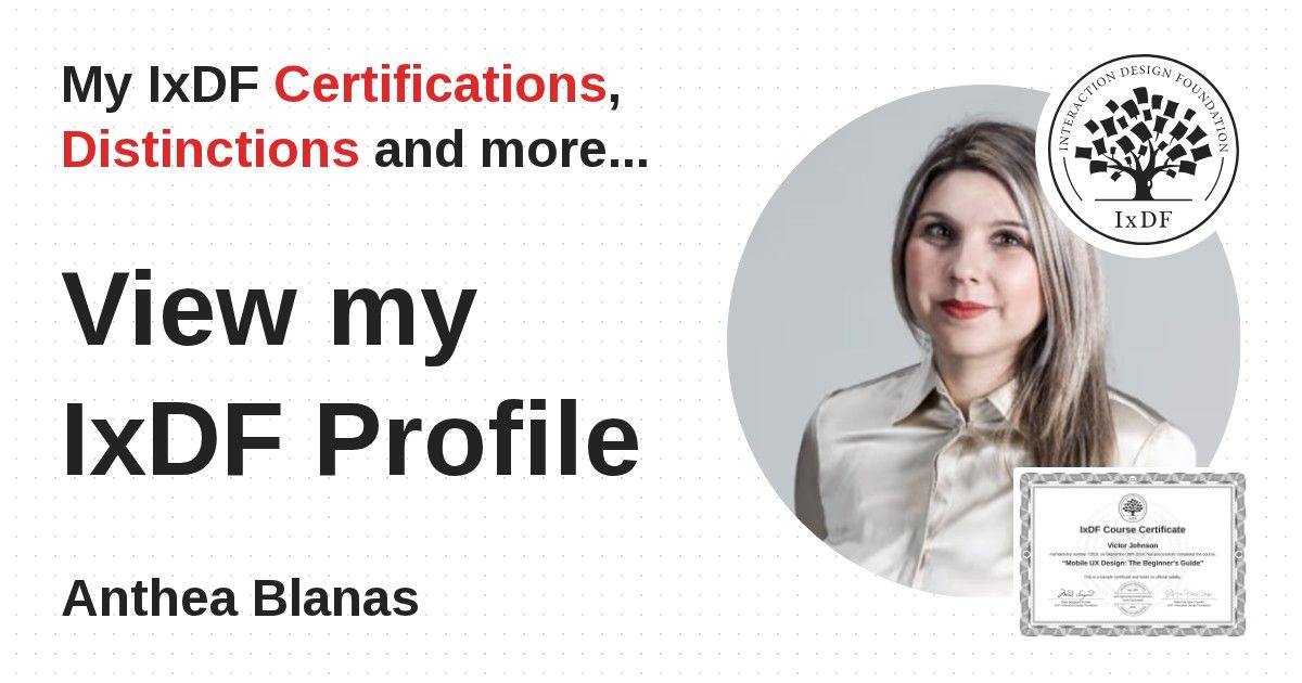 IxDF Course Certificates are awarded to Anthea Blanas in formal recognition of their coursework surpassing the rigorous benchmarks of exceptional performance established by the IxDF Educational Codex.