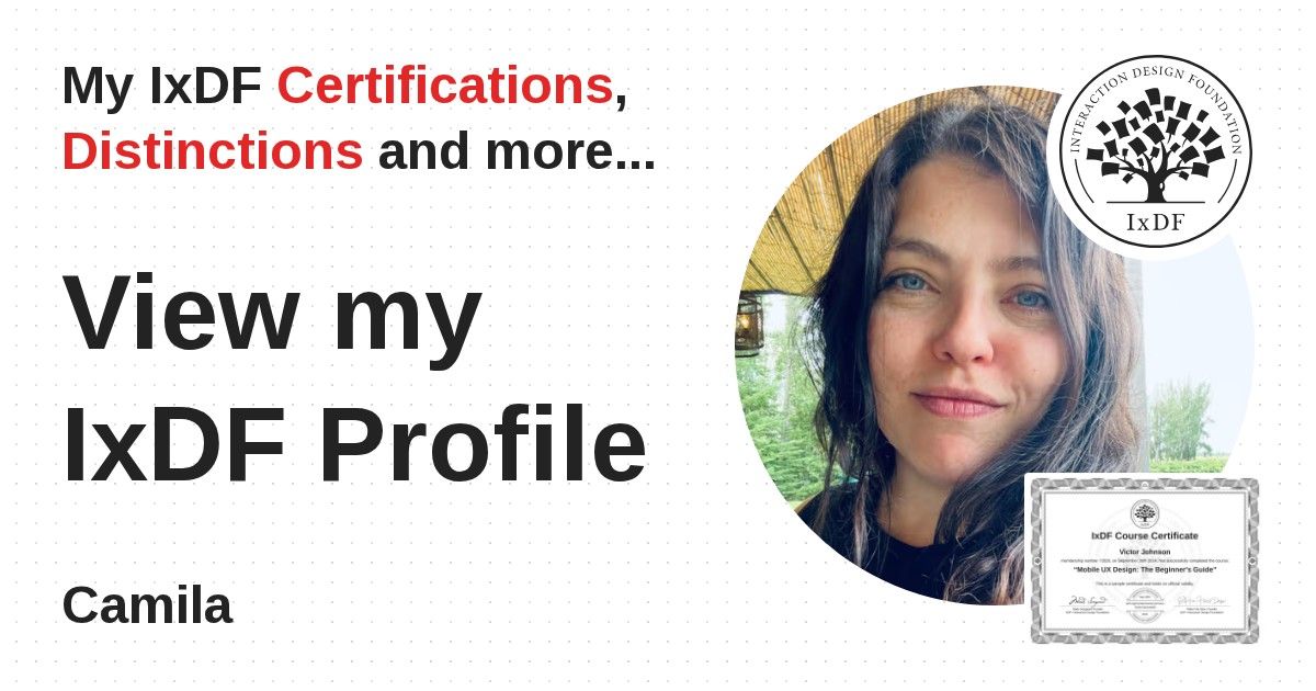 IxDF Course Certificates are awarded to Camila in formal recognition of their coursework surpassing the rigorous benchmarks of exceptional performance established by the IxDF Educational Codex.