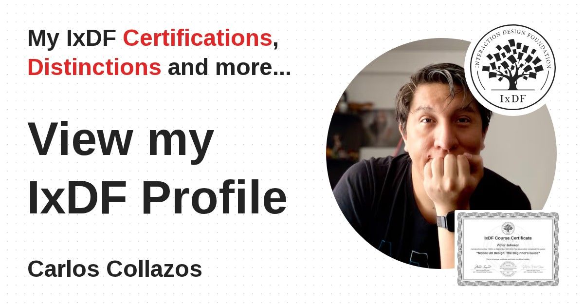 IxDF Course Certificates are awarded to Carlos Collazos in formal recognition of their coursework surpassing the rigorous benchmarks of exceptional performance established by the IxDF Educational Codex.