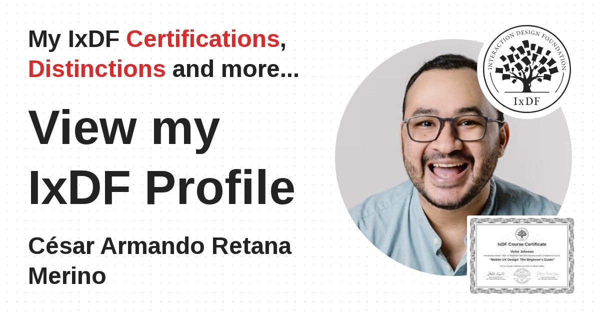 IxDF Course Certificates are awarded to César Armando Retana Merino in formal recognition of their coursework surpassing the rigorous benchmarks of exceptional performance established by the IxDF Educational Codex.