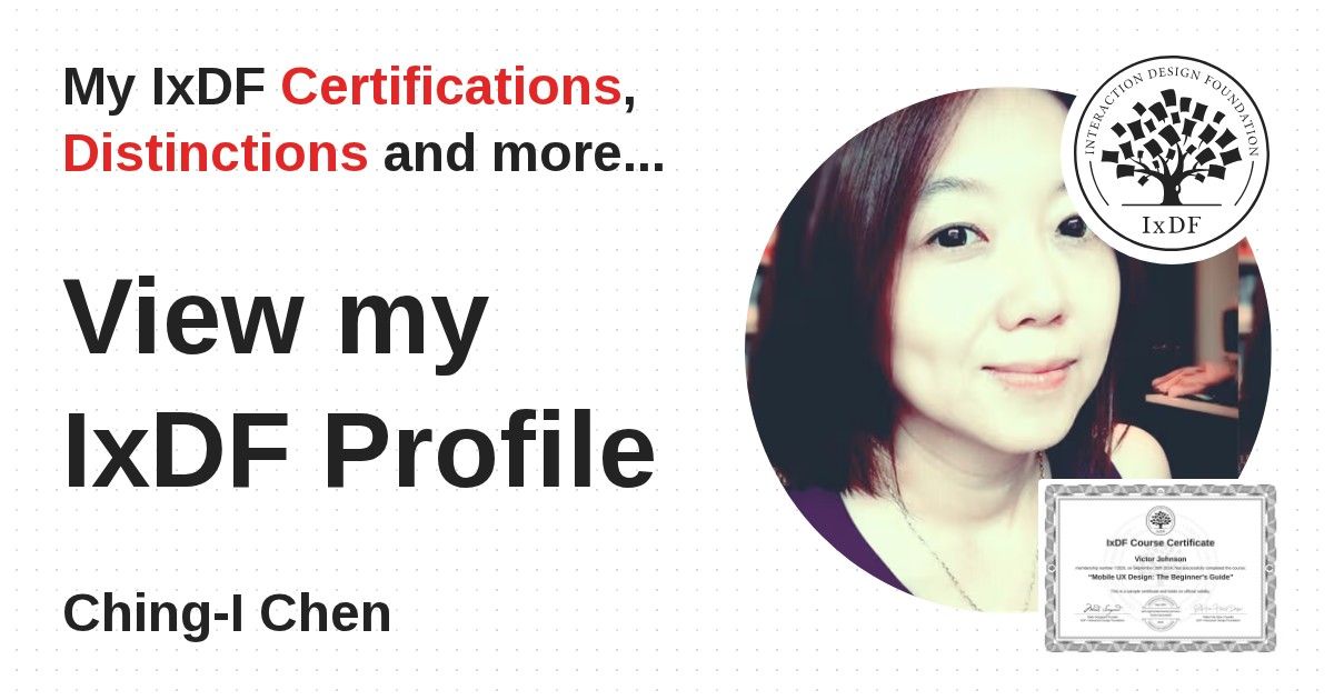IxDF Course Certificates are awarded to Ching-I Chen in formal recognition of their coursework surpassing the rigorous benchmarks of exceptional performance established by the IxDF Educational Codex.