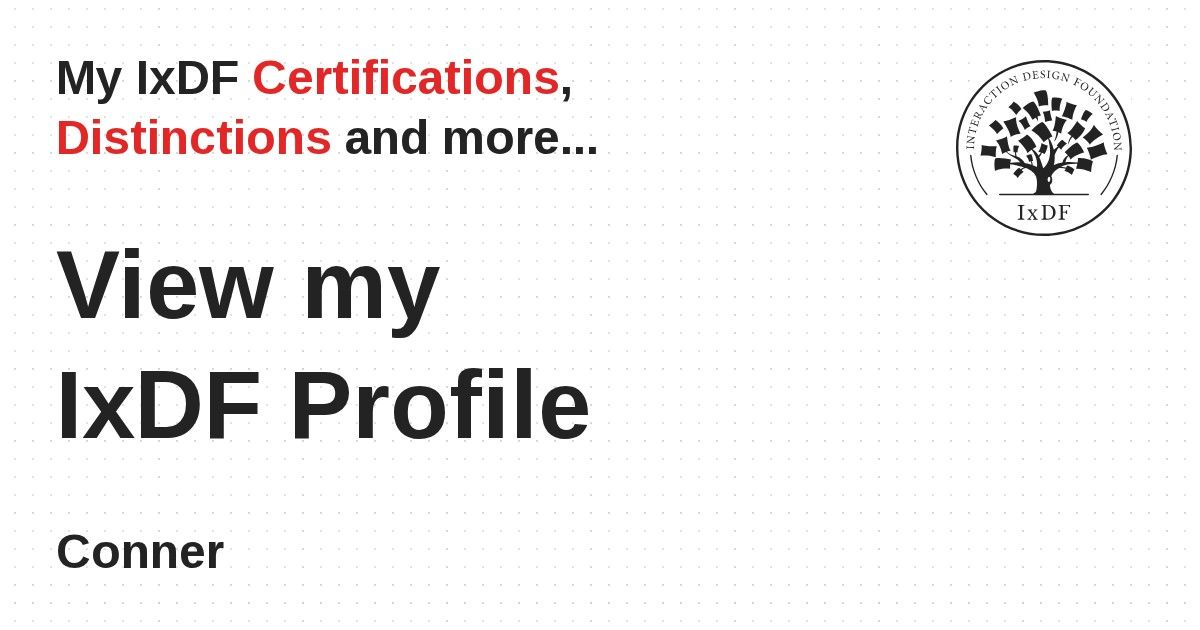 IxDF Course Certificates are awarded to Conner in formal recognition of their coursework surpassing the rigorous benchmarks of exceptional performance established by the IxDF Educational Codex.