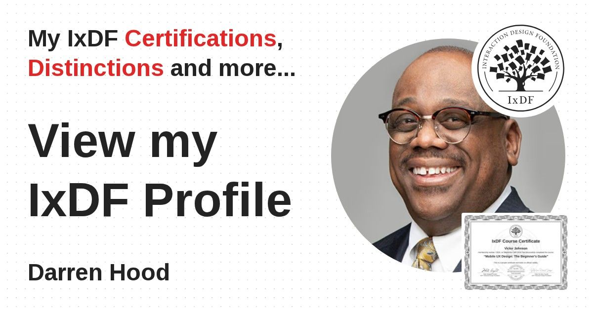 IxDF Course Certificates are awarded to Darren Hood in formal recognition of their coursework surpassing the rigorous benchmarks of exceptional performance established by the IxDF Educational Codex.