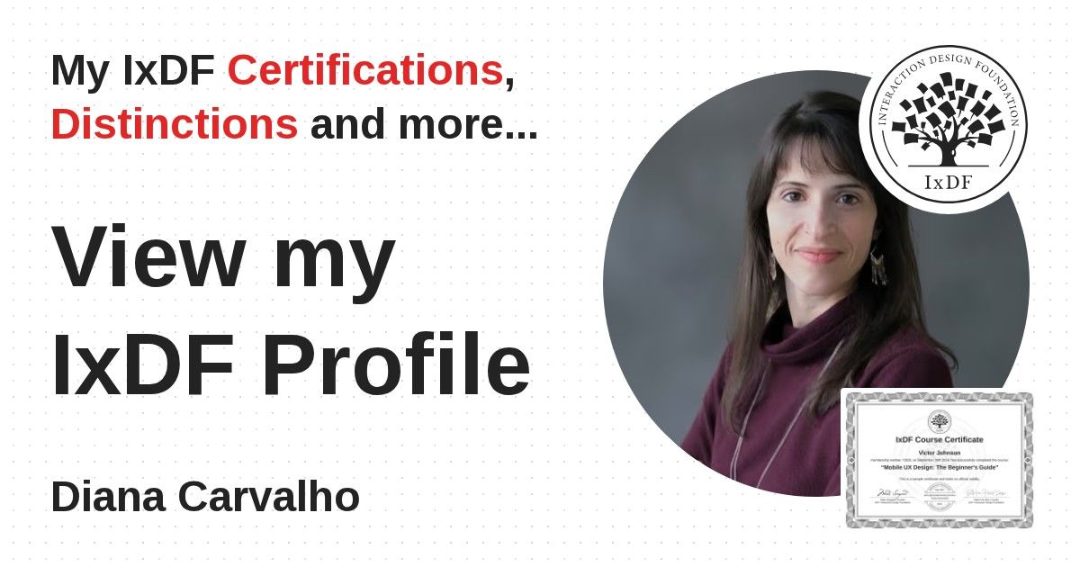 IxDF Course Certificates are awarded to Diana Carvalho in formal recognition of their coursework surpassing the rigorous benchmarks of exceptional performance established by the IxDF Educational Codex.