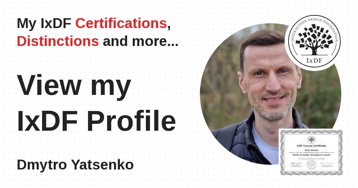 IxDF Course Certificates are awarded to Dmytro Yatsenko in formal recognition of their coursework surpassing the rigorous benchmarks of exceptional performance established by the IxDF Educational Codex.