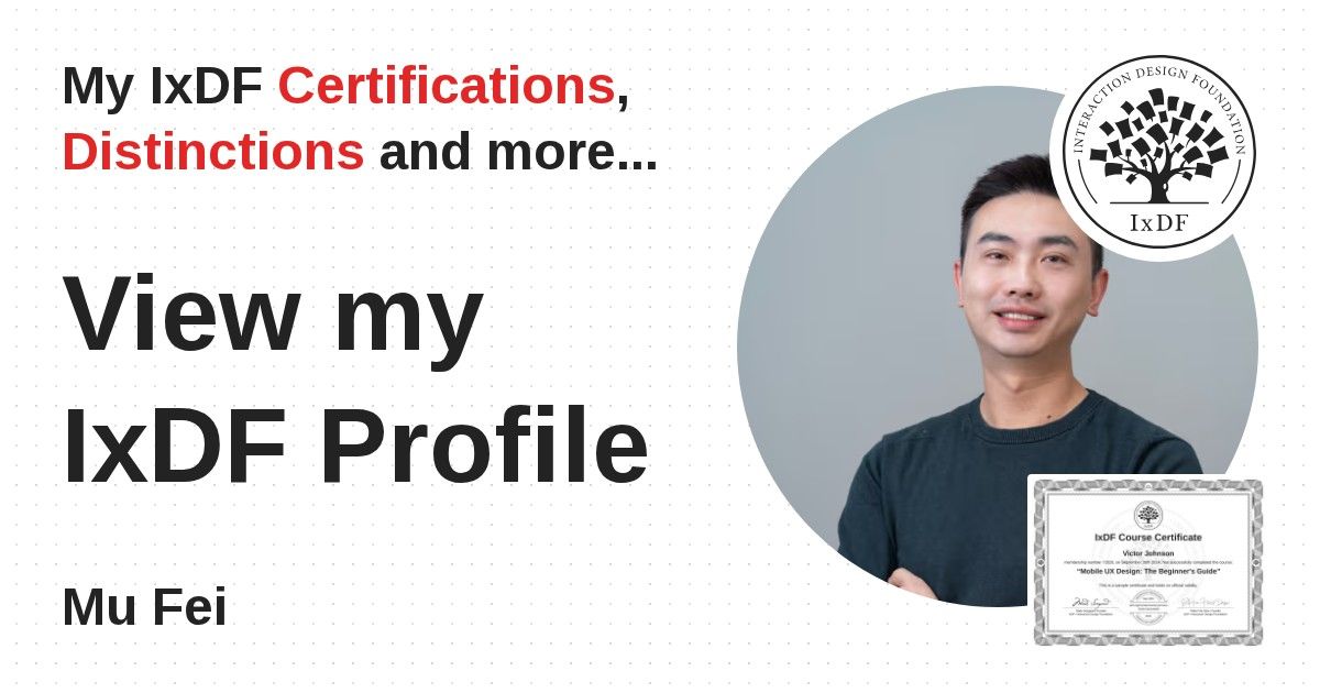IxDF Course Certificates are awarded to Mu Fei in formal recognition of their coursework surpassing the rigorous benchmarks of exceptional performance established by the IxDF Educational Codex.
