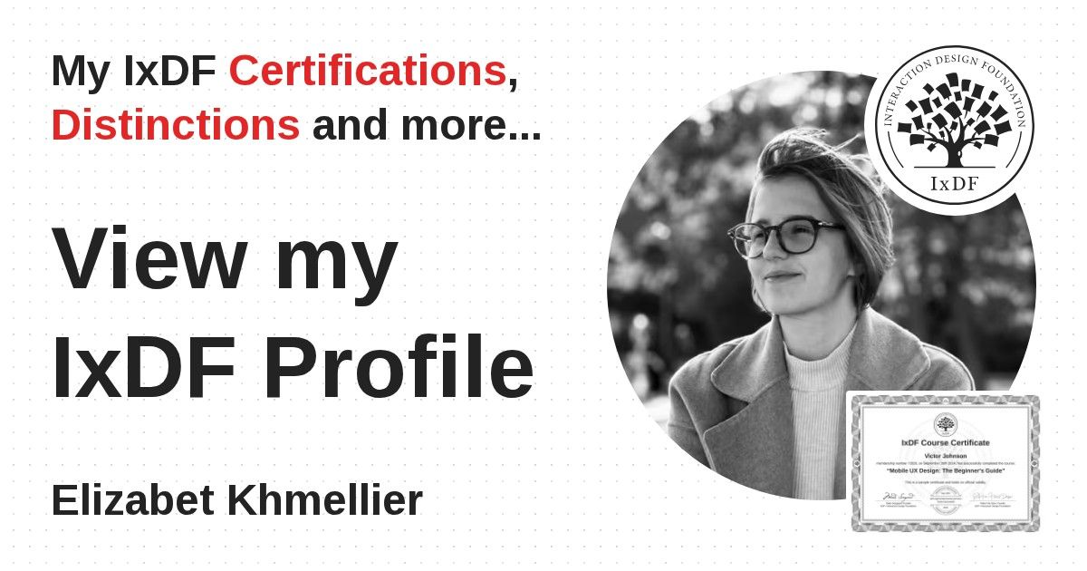 IxDF Course Certificates are awarded to Elizabet Khmellier in formal recognition of their coursework surpassing the rigorous benchmarks of exceptional performance established by the IxDF Educational Codex.