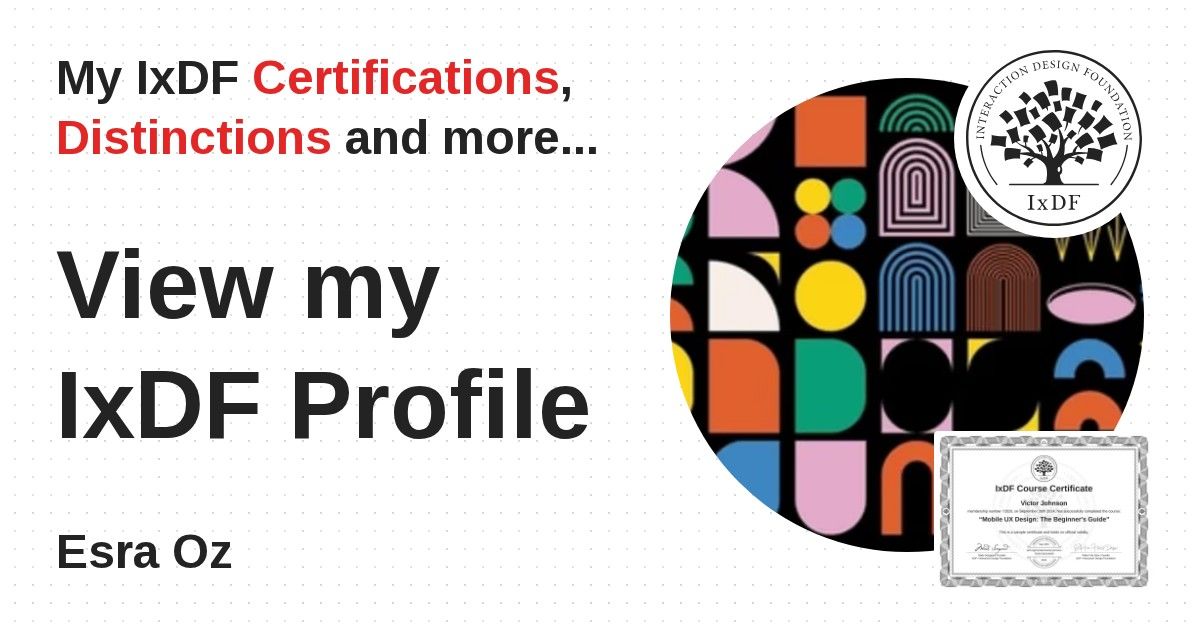 IxDF Course Certificates are awarded to Esra Oz in formal recognition of their coursework surpassing the rigorous benchmarks of exceptional performance established by the IxDF Educational Codex.