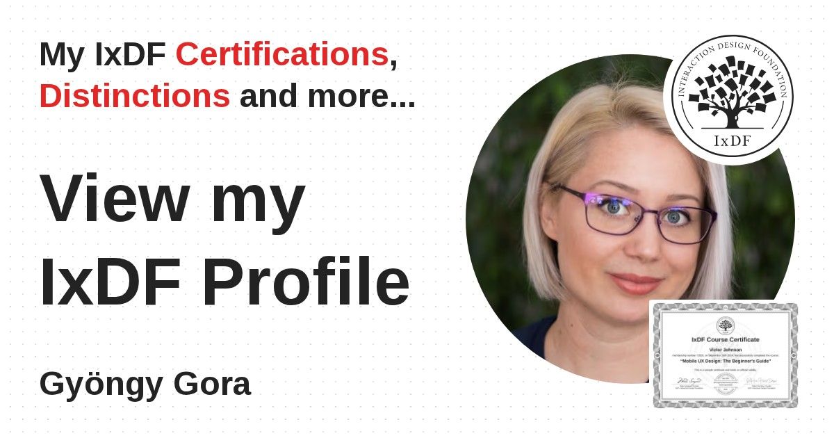 IxDF Course Certificates are awarded to Gyöngy Gora in formal recognition of their coursework surpassing the rigorous benchmarks of exceptional performance established by the IxDF Educational Codex.