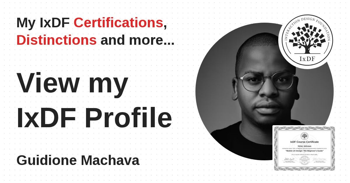 IxDF Course Certificates are awarded to Guidione Machava in formal recognition of their coursework surpassing the rigorous benchmarks of exceptional performance established by the IxDF Educational Codex.