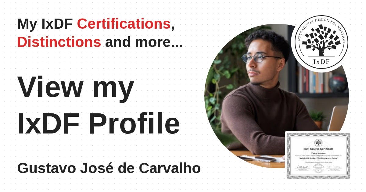 IxDF Course Certificates are awarded to Gustavo José de Carvalho in formal recognition of their coursework surpassing the rigorous benchmarks of exceptional performance established by the IxDF Educational Codex.