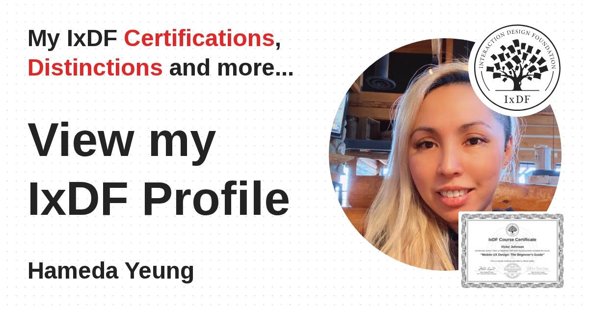 IxDF Course Certificates are awarded to Hameda Yeung in formal recognition of their coursework surpassing the rigorous benchmarks of exceptional performance established by the IxDF Educational Codex.