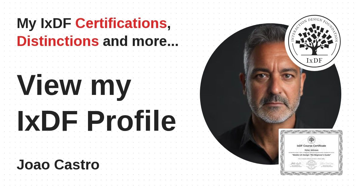 IxDF Course Certificates are awarded to Joao Castro in formal recognition of their coursework surpassing the rigorous benchmarks of exceptional performance established by the IxDF Educational Codex.