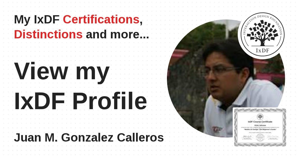 IxDF Course Certificates are awarded to Juan M. Gonzalez Calleros in formal recognition of their coursework surpassing the rigorous benchmarks of exceptional performance established by the IxDF Educational Codex.