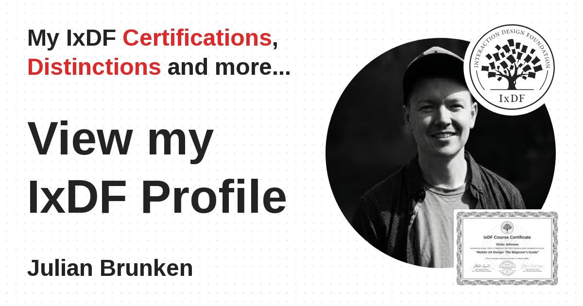 IxDF Course Certificates are awarded to Julian Brunken in formal recognition of their coursework surpassing the rigorous benchmarks of exceptional performance established by the IxDF Educational Codex.