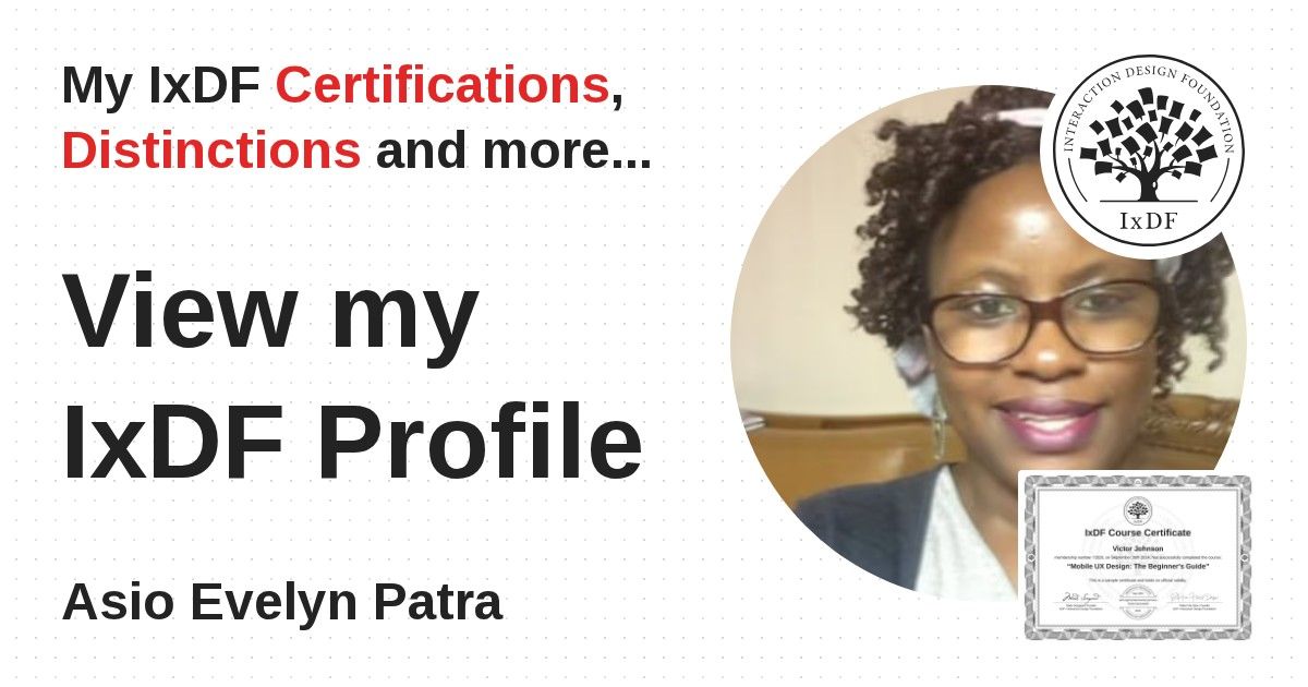 IxDF Course Certificates are awarded to Asio Evelyn Patra in formal recognition of their coursework surpassing the rigorous benchmarks of exceptional performance established by the IxDF Educational Codex.