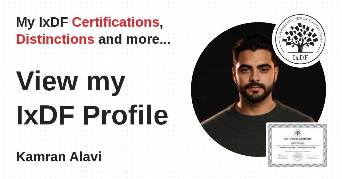 IxDF Course Certificates are awarded to Kamran Alavi in formal recognition of their coursework surpassing the rigorous benchmarks of exceptional performance established by the IxDF Educational Codex.