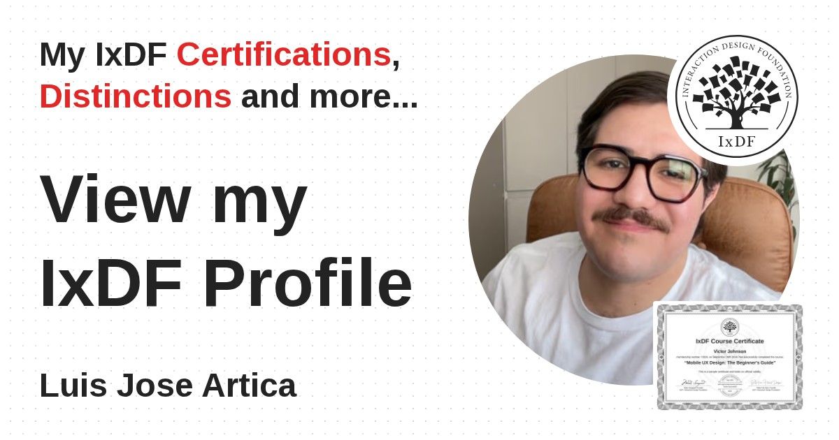 IxDF Course Certificates are awarded to Luis Jose Artica in formal recognition of their coursework surpassing the rigorous benchmarks of exceptional performance established by the IxDF Educational Codex.