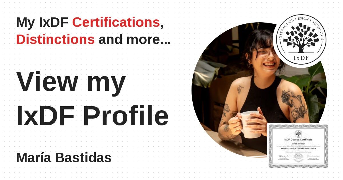 IxDF Course Certificates are awarded to María Bastidas in formal recognition of their coursework surpassing the rigorous benchmarks of exceptional performance established by the IxDF Educational Codex.