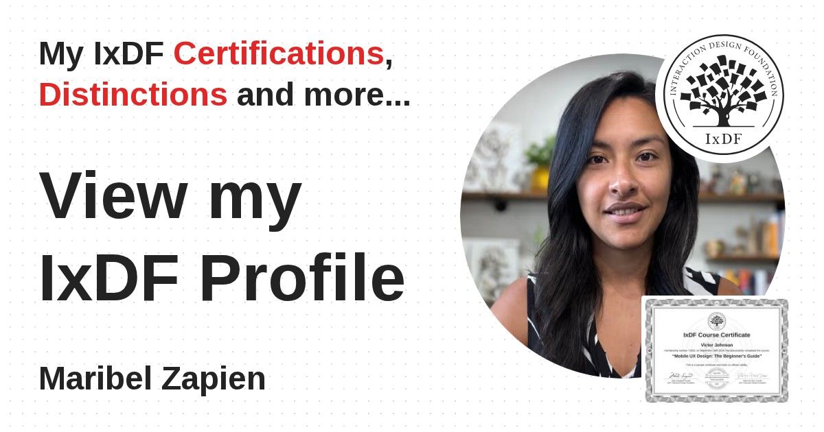 IxDF Course Certificates are awarded to Maribel Zapien in formal recognition of their coursework surpassing the rigorous benchmarks of exceptional performance established by the IxDF Educational Codex.