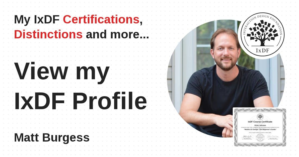 IxDF Course Certificates are awarded to Matt Burgess in formal recognition of their coursework surpassing the rigorous benchmarks of exceptional performance established by the IxDF Educational Codex.