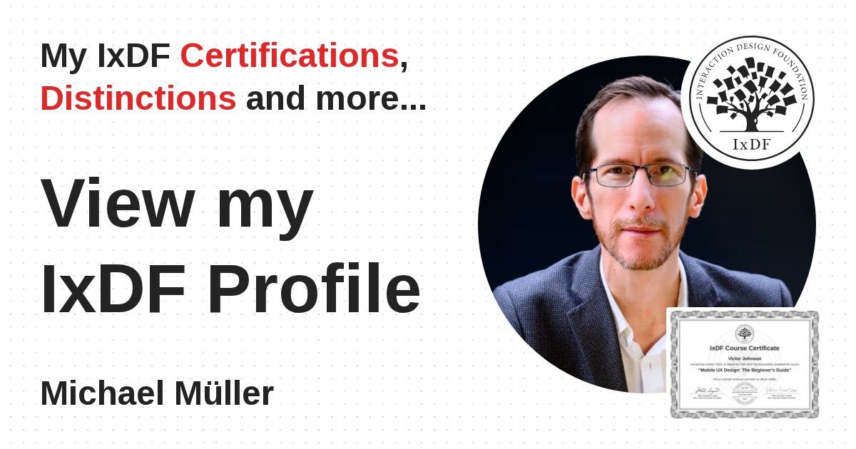 IxDF Course Certificates are awarded to Michael Müller in formal recognition of their coursework surpassing the rigorous benchmarks of exceptional performance established by the IxDF Educational Codex.