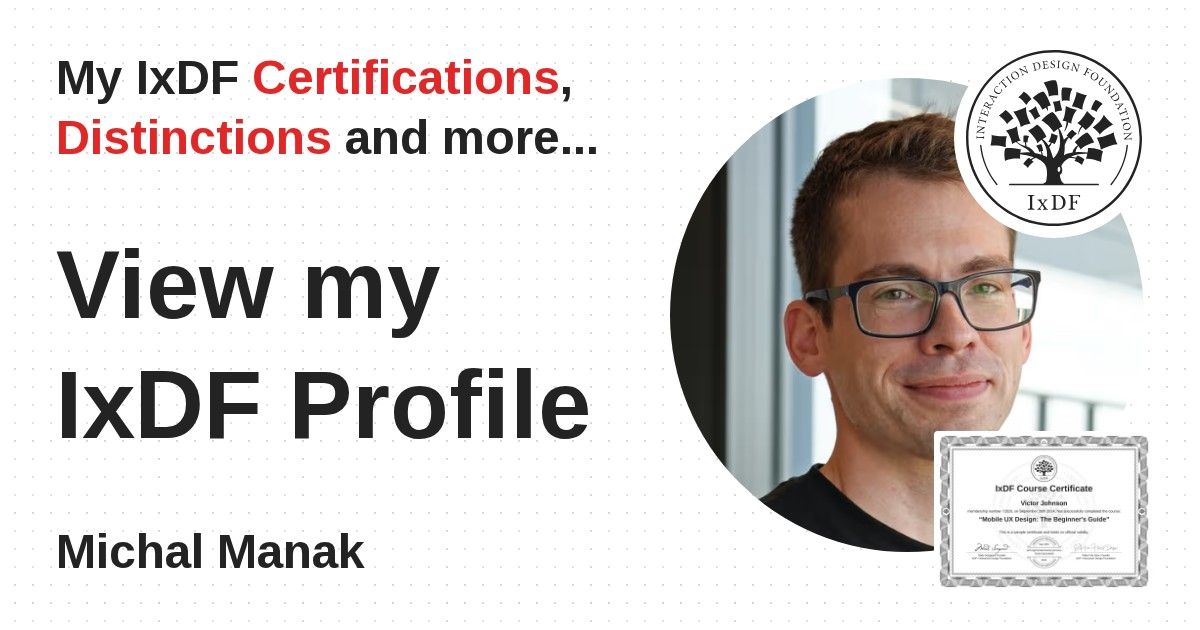 IxDF Course Certificates are awarded to Michal Manak in formal recognition of their coursework surpassing the rigorous benchmarks of exceptional performance established by the IxDF Educational Codex.