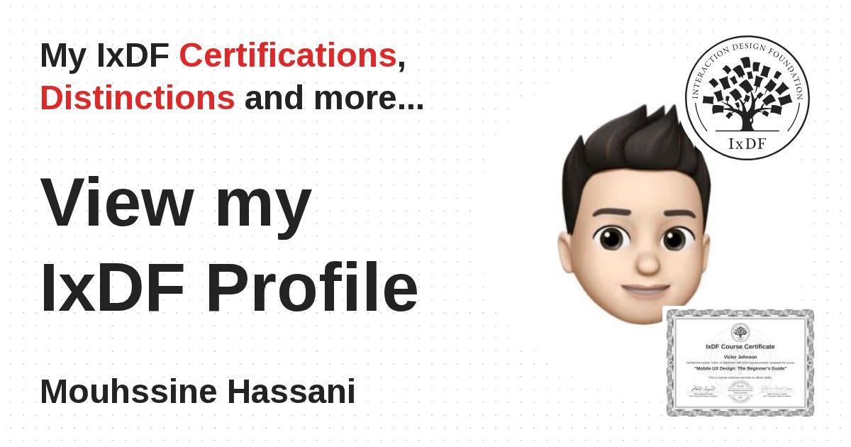 IxDF Course Certificates are awarded to Mouhssine Hassani in formal recognition of their coursework surpassing the rigorous benchmarks of exceptional performance established by the IxDF Educational Codex.