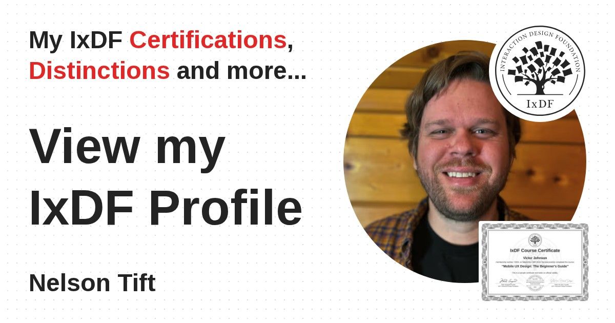IxDF Course Certificates are awarded to Nelson Tift in formal recognition of their coursework surpassing the rigorous benchmarks of exceptional performance established by the IxDF Educational Codex.
