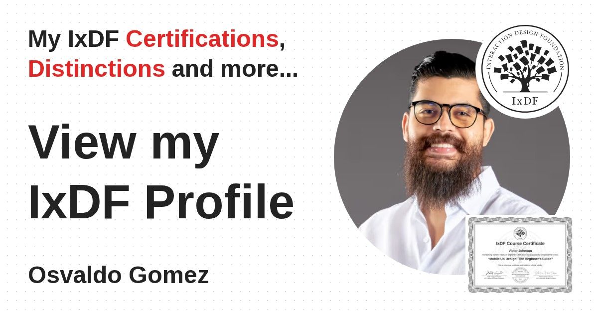 IxDF Course Certificates are awarded to Osvaldo Gomez in formal recognition of their coursework surpassing the rigorous benchmarks of exceptional performance established by the IxDF Educational Codex.