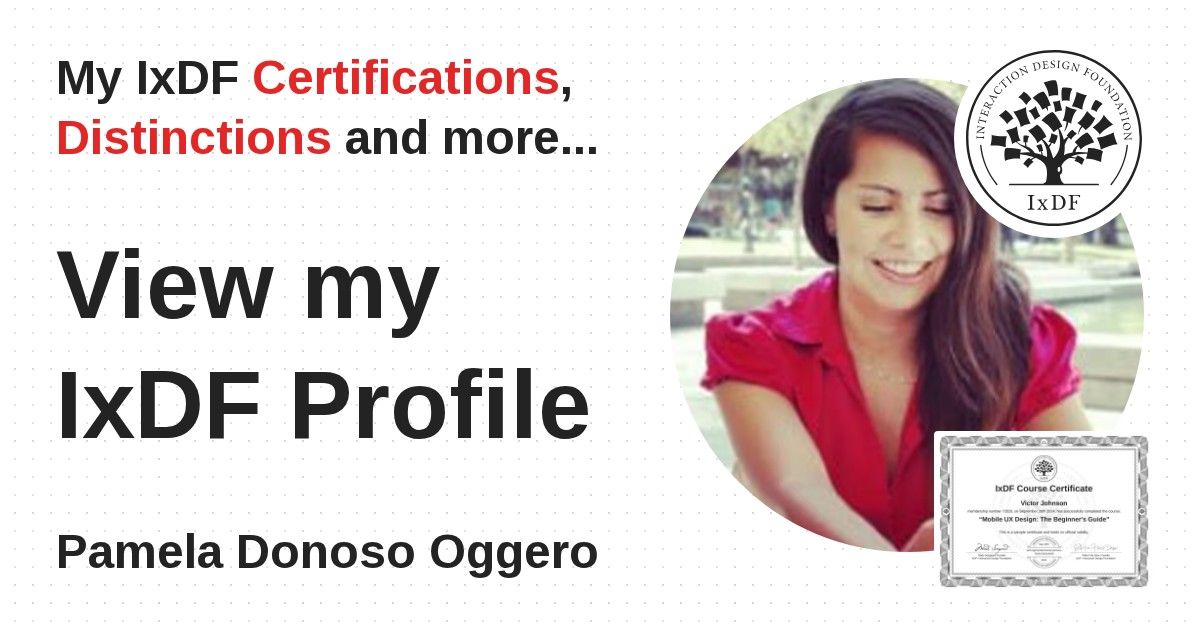 IxDF Course Certificates are awarded to Pamela Donoso Oggero in formal recognition of their coursework surpassing the rigorous benchmarks of exceptional performance established by the IxDF Educational Codex.