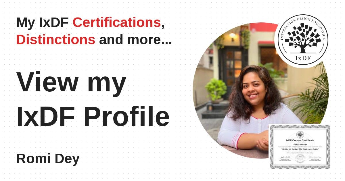 IxDF Course Certificates are awarded to Romi Dey in formal recognition of their coursework surpassing the rigorous benchmarks of exceptional performance established by the IxDF Educational Codex.