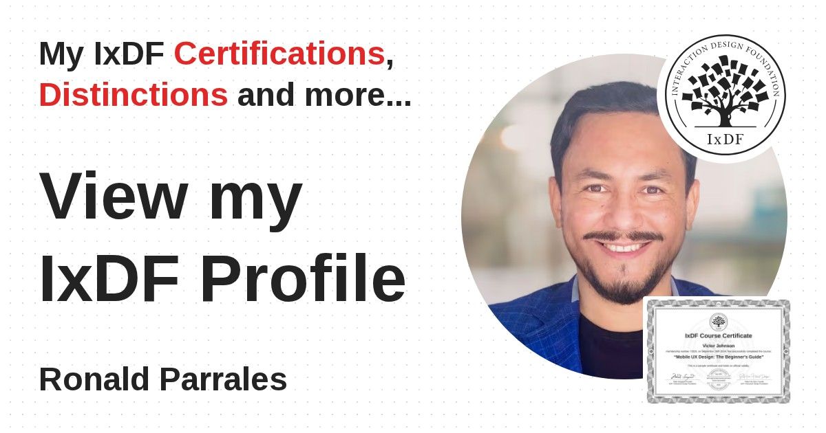 IxDF Course Certificates are awarded to Ronald Parrales in formal recognition of their coursework surpassing the rigorous benchmarks of exceptional performance established by the IxDF Educational Codex.