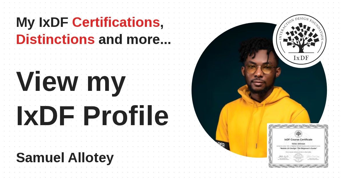 IxDF Course Certificates are awarded to Samuel Allotey in formal recognition of their coursework surpassing the rigorous benchmarks of exceptional performance established by the IxDF Educational Codex.