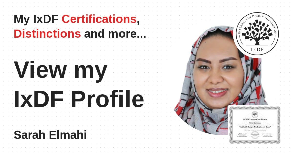IxDF Course Certificates are awarded to Sarah Elmahi in formal recognition of their coursework surpassing the rigorous benchmarks of exceptional performance established by the IxDF Educational Codex.