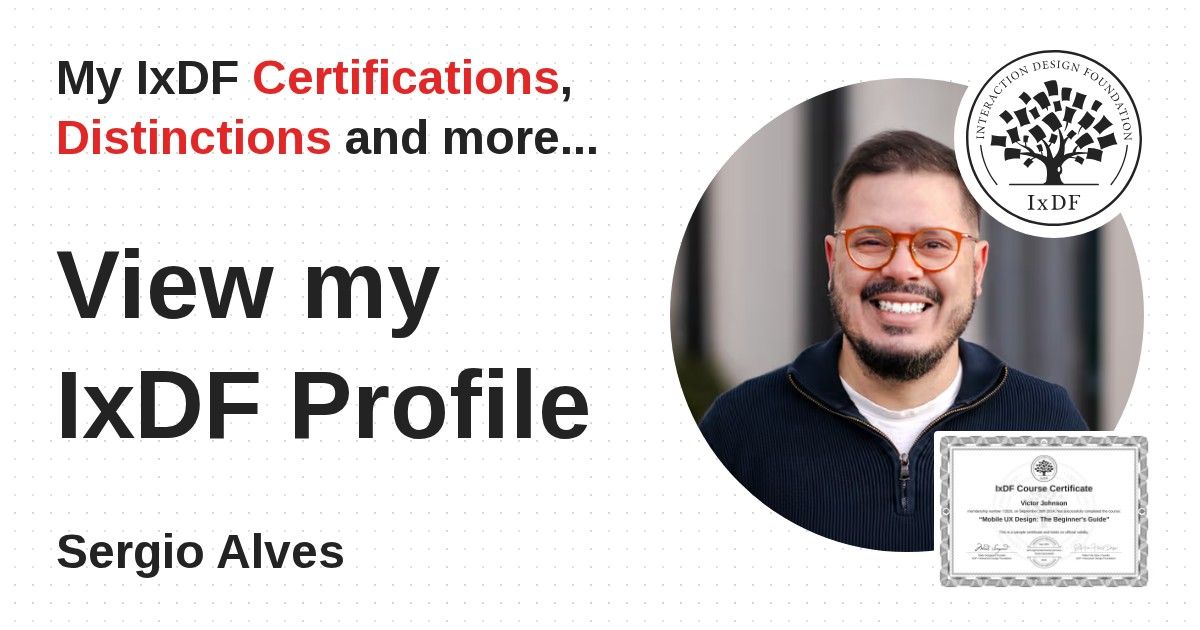 IxDF Course Certificates are awarded to Sergio Alves in formal recognition of their coursework surpassing the rigorous benchmarks of exceptional performance established by the IxDF Educational Codex.