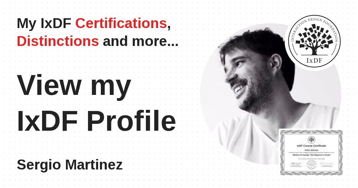 IxDF Course Certificates are awarded to Sergio Martinez in formal recognition of their coursework surpassing the rigorous benchmarks of exceptional performance established by the IxDF Educational Codex.