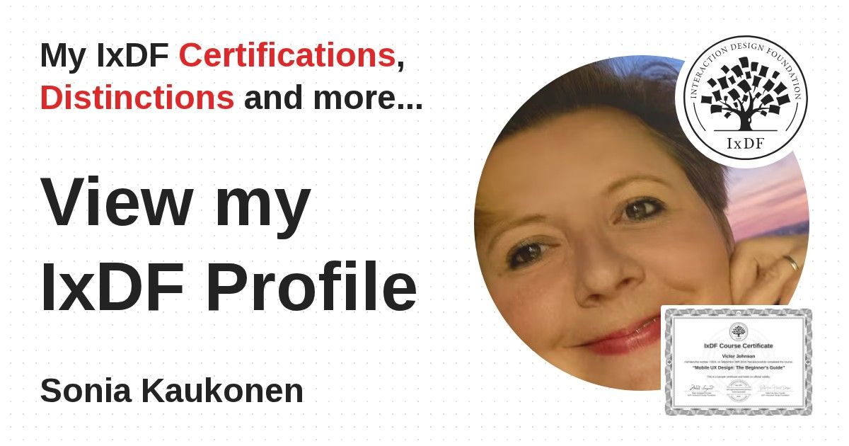 IxDF Course Certificates are awarded to Sonia Kaukonen in formal recognition of their coursework surpassing the rigorous benchmarks of exceptional performance established by the IxDF Educational Codex.