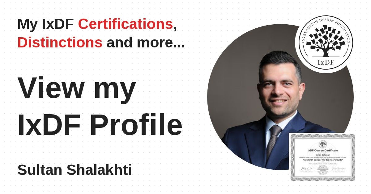 IxDF Course Certificates are awarded to Sultan Shalakhti in formal recognition of their coursework surpassing the rigorous benchmarks of exceptional performance established by the IxDF Educational Codex.