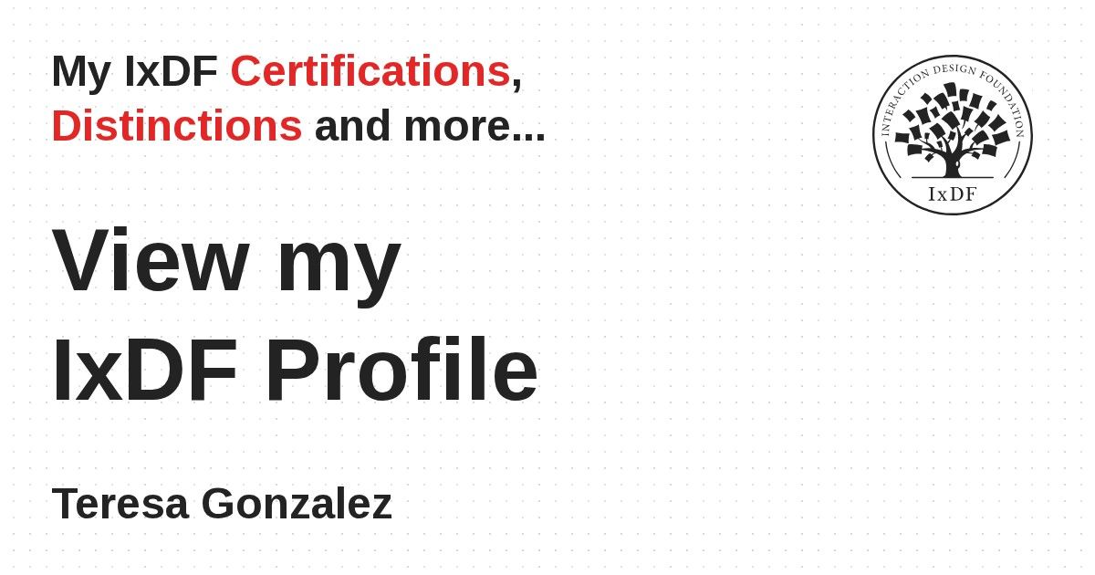 Distinctions are conferred upon Teresa Gonzalez in formal recognition of their notable achievements and contributions, as stipulated by the IxDF Educational Codex.